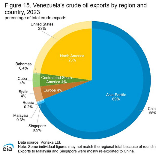I am quite partial to the argument that Cuba may be part of the calculation. But these numbers from the Economist brought me up short: “in recent years mismanagement of Venezuela’s petroleum industry and international sanctions caused shipments to Cuba to fall by almost three-quarters, from more than 100,000 barrels per day in 2021—about 80% of its domestic needs—to 16,000 b/d in 2025.” So Cuba is already more or less cut from Venezuelan supply.
